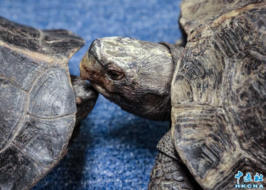 7月27日,香港漁護署與警方舉行記者會,公佈本月19日採取聯合行動,在大埔區一處所檢獲29隻受管制瀕危龜隻,以及7隻懷疑龜蛋和一批懷疑捕獵器具,拘捕一名懷疑涉案的本地男子。圖為檢獲的亞洲巨龜。 (香港中通社記者 謝光磊攝)