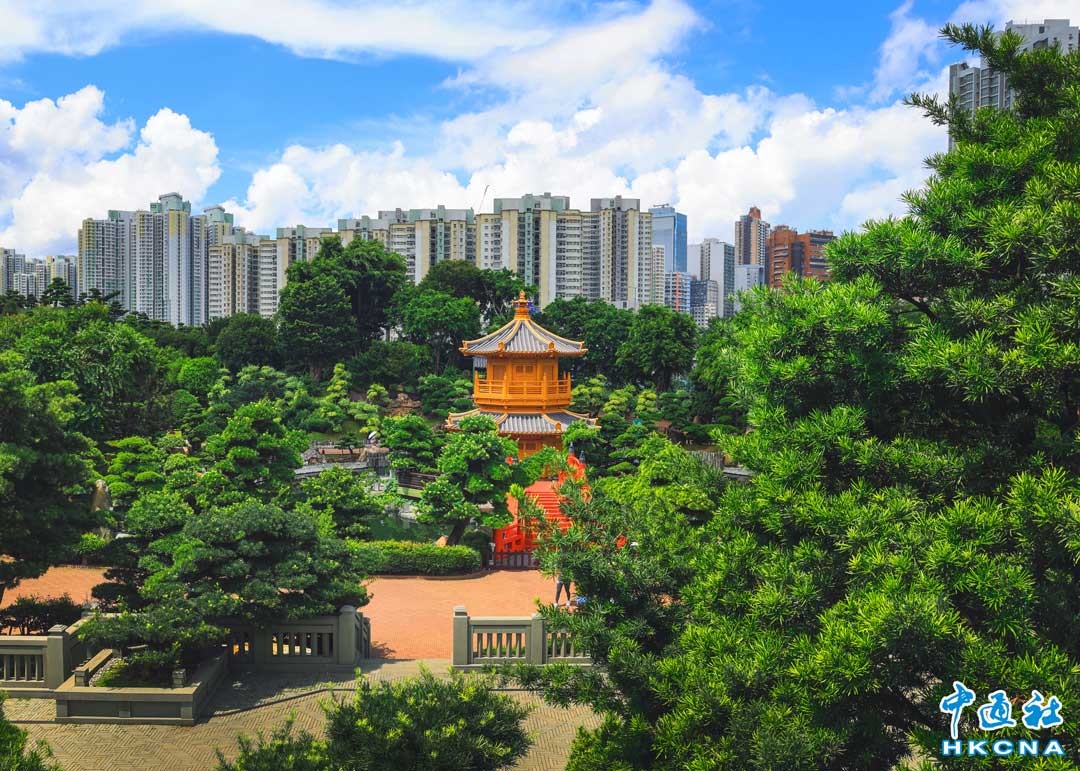 位於香港鑽石山的志蓮淨苑是一座廟宇,南蓮園池是個古式園林,兩者都是仿照唐代藝術風格設計,並由一座橋毗連。雖處繁華喧鬧的市中心,但別具寧靜平和的氣息,是都市中的淨土,微雨之時,亭殿之間綠樹環抱,雨入樓斜,美不勝收。圖為南蓮園池。 (香港中通社記者 曹文毓攝)