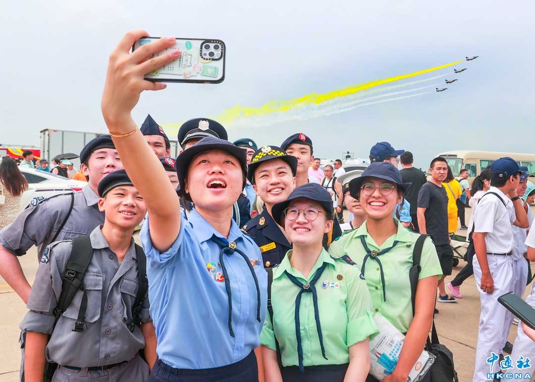 7月28日,吉林長春,60名來自香港和澳門的青少年參觀空軍航空開放活動·長春航空展。圖為來自香港的青少年在現場自拍合影。香港中通社圖片