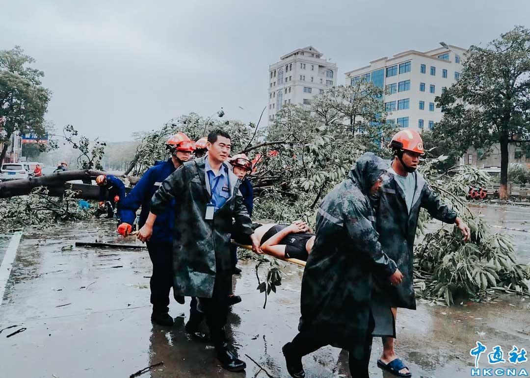 7月28日9時55分,今年第5號颱風“杜蘇芮”在福建晉江沿海登陸,登陸時中心附近最大風力15級(50米/秒,強颱風級)。圖為晉江市公安局民警聯合消防員轉移受困人員。香港中通社圖片