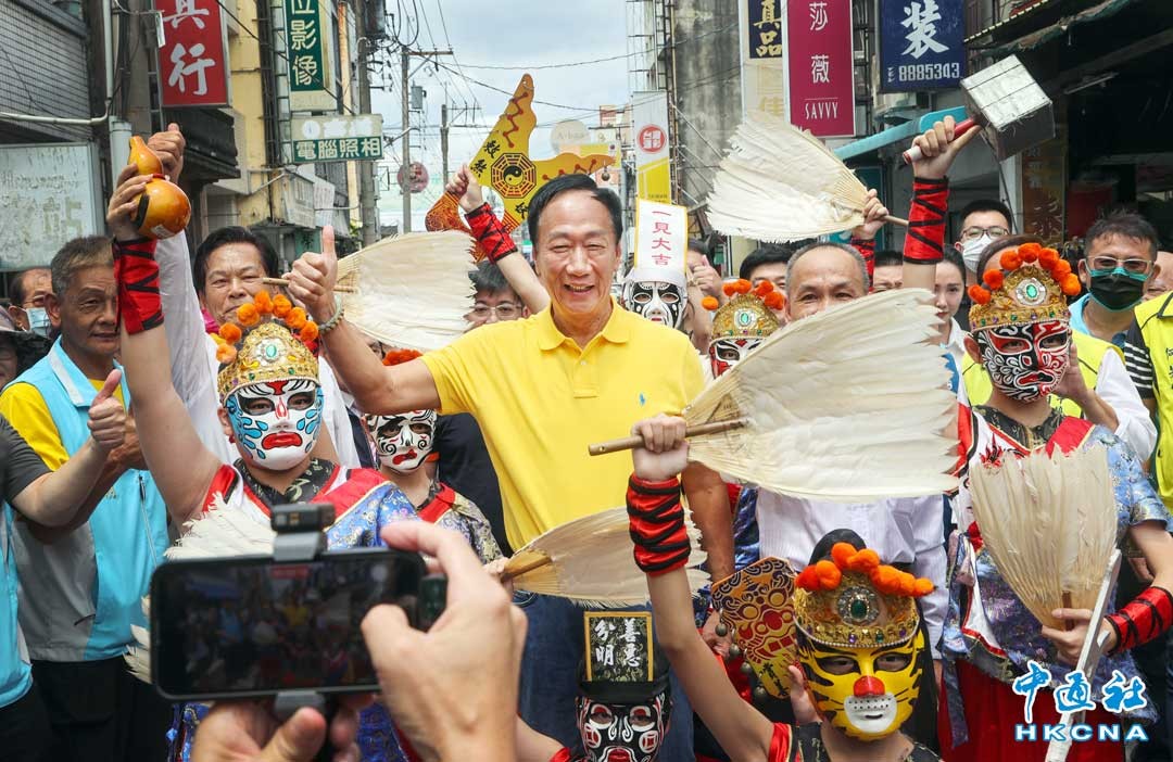 台灣鴻海創辦人郭台銘7月29日前往彰化縣北斗鎮奠安宮參與廟會活動,沿途與民眾握手寒喧。香港中通社圖片