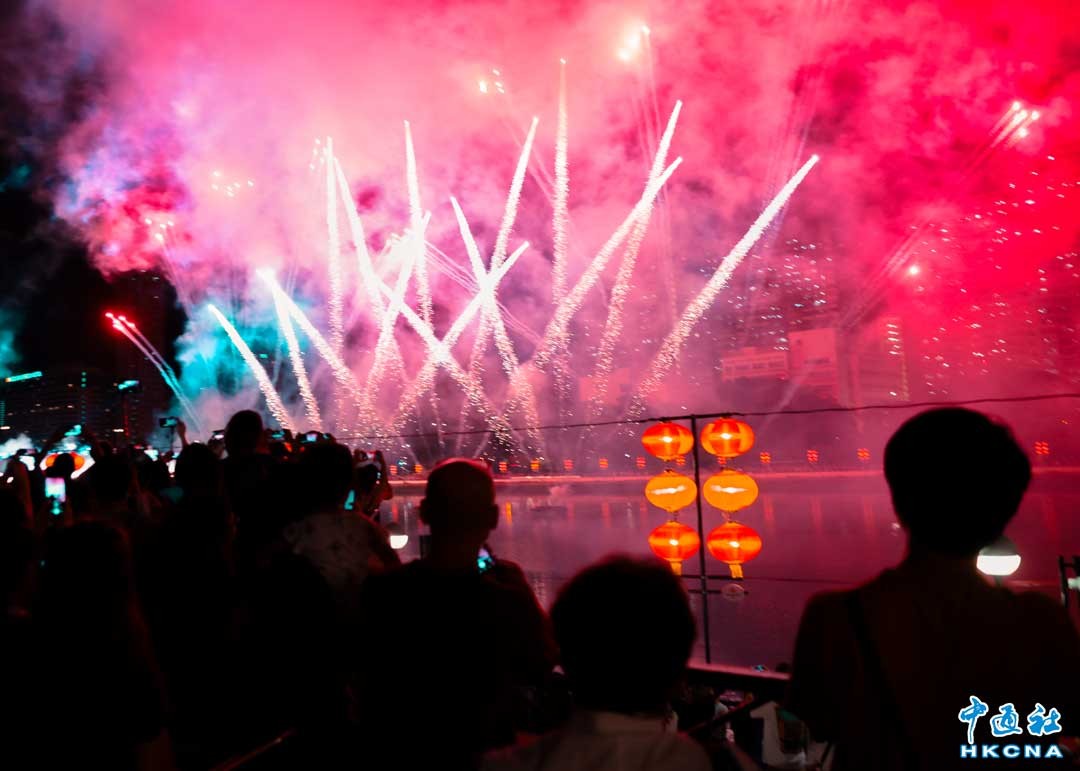 7月30日,2023沙田節在城門河畔舉行開幕典禮,同時舉辦“華光輝映·閃耀城河·沙田節開幕禮暨慶祝香港回歸祖國26週年煙火光影匯”,這是首次有無人機、煙火及光影匯演於城門河上空聯合上演,象徵著沙田區慶祝香港回歸祖國26週年的一系列活動進入高潮。圖為大批市民在城門河畔瀝源橋一帶欣賞煙火光影匯演。 (香港中通社記者 謝光磊攝)