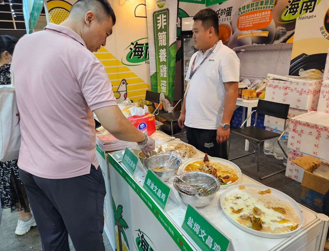 市民在海南展團展位試食文昌雞。(香港中通社記者 黃璇攝) 組展方介紹,農業農村部有兩大計劃,一是“農業品牌精品培育計劃”,二是“農業國際貿易高質量發展基地”(國貿基地),這兩大計劃目前都在不斷推進,並形成一個企業庫。“該計劃採取申報制,我們會不斷對企業進行評價、篩選。企業遞交申報材料後,經過專家評審合格,我們會將其入庫。入庫後,貿促中心會重點推介這兩個企業庫裡的企業。國貿基地目前完成了第二批篩選,有200多家企業入庫。” 本次參展則匯聚了“農業品牌精品培育計劃”首批發布的區域公用品牌及核心授權企業(註:區域公用品牌指在一個具有特定的自然環境、人文歷史或生產加工歷史的區域內,由相關組織註冊和管理,並授權若干農業生產經營者共同使用的農產品品牌)。本屆也是參展以來組展面積最大、展團企業最多、展品類別最豐富、品牌推廣最集中的一屆。