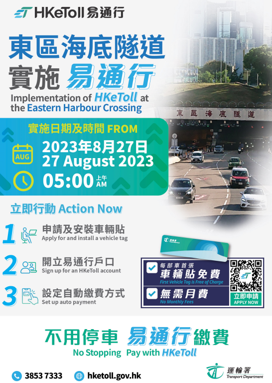運輸署圖片。 運輸署表示,現時有98%的車輛已獲發車輛貼。在平均每日約38萬架次駛經五條已實施“易通行”的隧道中,約九成的車輛偵測到有安裝車輛貼,約七成的車輛使用自動繳費方式。 運輸署再次提醒尚未繳交隧道費的車主,必須在駛經隧道後的14個工作天內補交。他們可以登入“易通行”網站(按此hketoll.gov.hk)或流動應用程式,查閱須繳付的隧道費並以信用卡繳費,或按指示產生繳費所用的二維碼,使用轉數快或到7-11便利店以現金繳付隧道費。“易通行”網站載有短片,指導車主如何在網上補交隧道費。他們亦可前往四個客戶服務中心及四個服務點繳費。