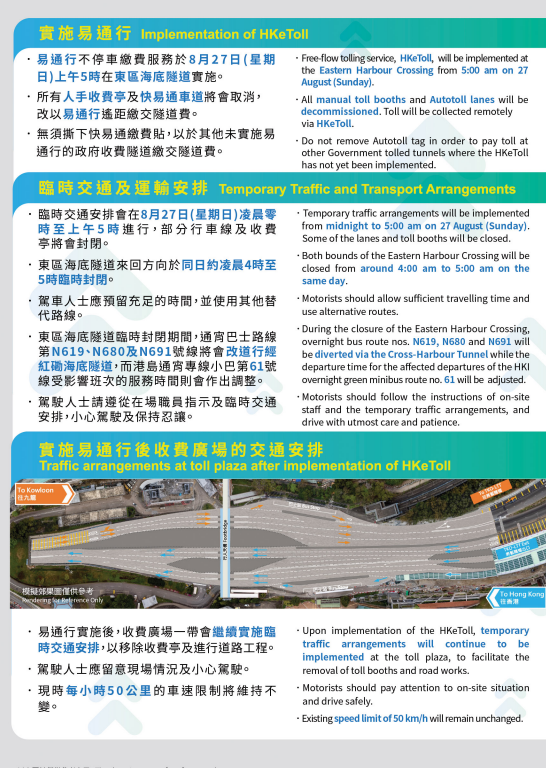 特區政府圖片。 東隧來回方向及其支路將會由8月27日上午4時至5時臨時封閉。在東隧臨時封閉期間,共有3條通宵專營巴士路線需改道行經紅磡海底隧道(紅隧),包括第N619號線(順利 — 中環(港澳碼頭))、第N680號線(錦英苑 — 中環(港澳碼頭))及第N691號線(調景嶺 — 中環(港澳碼頭))。因應改道安排,該3條巴士路線(來回方向)設於東隧收費廣場的巴士站將臨時取消,並於紅隧收費廣場增設臨時巴士站。 至於第N680號線(來回方向)將會於鯉魚門道(西行)近藍田港鐡站增設臨時巴士站,而該3條巴士路線其餘的原有巴士站點將不受影響。港島通宵專線小巴第61號線(小西灣(藍灣半島)— 旺角(快富街))受影響班次的服務時間將作調整。