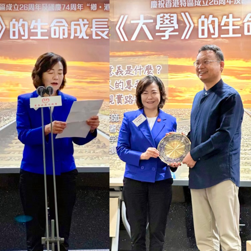 冀魯旅港同鄉會副會長、河北省政協常委劉興首先致歡迎詞。 之後,香港民政事務總署署長張趙凱渝太平紳士致辭。她稱讚冀魯旅港同鄉會長期以來加強在港鄉親的交流與聯繫,充分發揮同鄉社團的橋樑作用,堅守愛國愛港愛鄉的信念,凝聚鄉親力量、支持特區政府依法施政,也熱心參與社區的事務,一同爲國家和香港的發展盡心盡力。她說儒家思源遠流長,博大精深,是中國傳統文化的根基所在;本次講座邀請文運老師以《大學》為切入點,探討生命意義,以儒家思想文化啟迪人心,對于香港人了解中國歷史文化、探索生命意義具有重要作用。最後她說本次活動是民政事務總署“鄉.港連心計劃”之一,旨在推廣愛國愛港愛鄉的精神,加深市民對中華文化的認識,她對于冀魯旅港同鄉會大力支持該項計劃,表示由衷感謝。