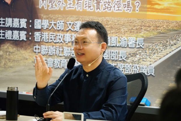 香港立法會教育事務委員會副主席鄧飛議員壓軸致辭,並向多個協辦機構頒贈合作紀念盤。 開幕式之後,文運老師正式開講。文運老師本名焦自偉,文學學士、法學碩士、管理學博士。24歲考入中央國家機關,35歲擔任司級職務,40歲主動辭去公職,創辦文運心塾,致力于培養有文化情懷、有成長能力、有責任擔當的社會人才。 文運老師從中國文化的源頭講起,認爲中國文化對人的生命價值寄予了無限的期待。他結合個人多年的體會,分享了四句話:“探索根本規律,發現內心世界,追求無限價值,擔當天下道義”。他說萬事萬物都是關聯的、相通的、統一的,背後有一個根本規律,也就是道。道具有不生不滅(超越時間)、不垢不淨(超越性質)、不增不减(超越空間)的特徵,貫穿于一切人事物。因此,探索根本規律,只需要從任何一個人事物上,透過表象,鍥入到它所承載的道的層面就可以了。而在一切人事物中,最爲方便的,就是回到我們自己的內心世界中來。因此,文運老師指出,要研究內心世界,有且僅有一個工具——心念,也就是用自己的心研究自己的內心世界。