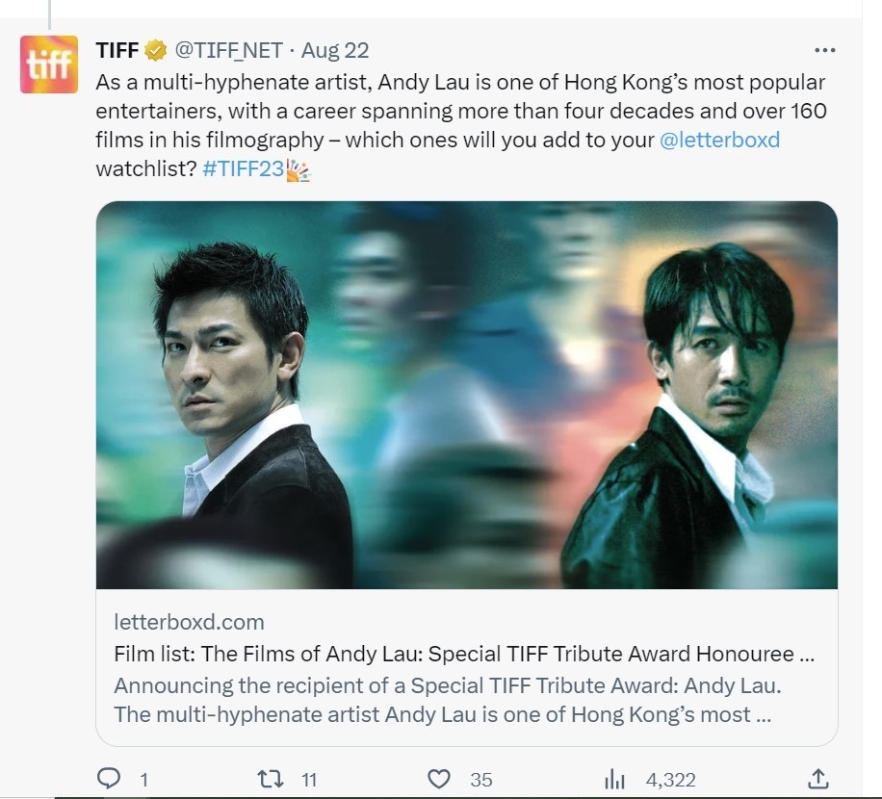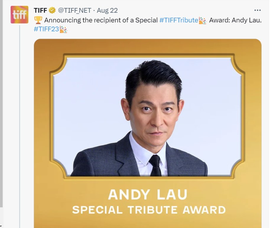 (圖源:TIFF推特) 據悉,劉德華主演的電影《紅毯先生》今年也有參展,大會將於9月15日舉行的首映禮上頒發獎項給他。 近年,香港電影人表現不俗,在國際上屢獲獎項。早前,演員楊紫瓊於第95屆奧斯卡金像獎頒獎典禮榮獲“最佳女主角”獎項;演員梁朝偉亦榮獲第80屆威尼斯電影節終身成就金獅獎,是首名華人演員獲得這項殊榮。(完) 【編輯:刘春】