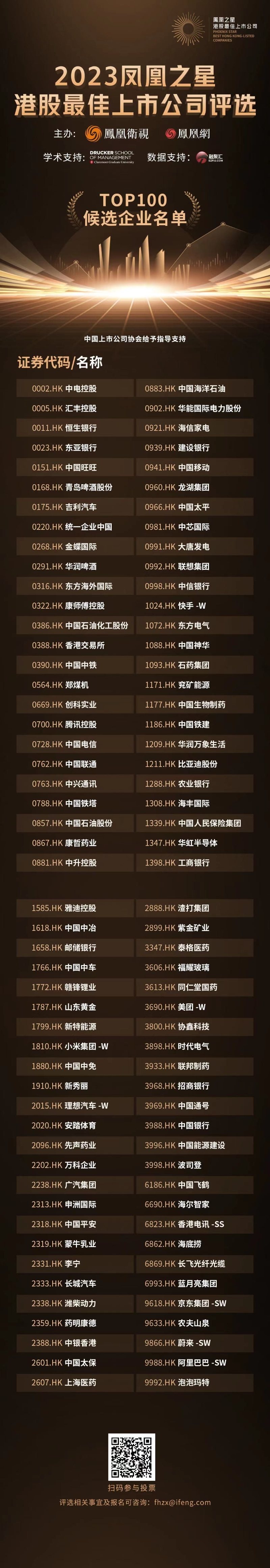 香港新聞網8月25日電 “2023鳳凰之星港股最佳上市公司”評選8月25日公布100家候選企業名單。 主辦方通過數據比對,綜合考量上市公司穩健性、成長性、投資者回報、品牌影響力等四個維度的數據情況,涵蓋總市值、淨資產收益率、營收增長、EBITDA(稅息折舊及攤銷前利潤)增長、PE歷史分位數、投資回報率、現金分紅率、回購、品牌價值、用戶關注度、日均換手率、自由現金流量、淨資產等量化指標,初選出100家候選企業。 從市值分布來看,100家候選企業中有9家市值在10000億港元以上,9家在5000億-10000億港元之間,40家在1000億-5000億港元之間,其餘42家在100億-1000億港元之間。 從營業收入來看,候選企業在最新財年實現31.67萬億港元營業收入,相比去年的30.91萬億港元增長了2.46%。其中,營業收入在10000億港元以上的企業有7家,在5000億-10000億港元之間的有11家,34家在1000億-5000億港元之間,其餘48家在1000億港元以下。 淨利潤方面,候選企業在最新財年合計實現3.46萬億港元淨利潤,相比上一年度的3.25萬億港元增長6.46%。其中,10家企業淨利潤在1000億港元以上,31家在100億-1000億港元之間,剩餘59家在100億港元以下。 與此同時,100家候選企業在回饋股東方面表現突出,於去年合計派發1.32萬億港元的現金分紅。 在推動科技創新方面,已披露研發投入數據的候選企業在去年合計投入研發資金7781.56億港元,同比增長17.57%。 從行業屬性劃分來看,按照“GICS(全球行業分類標準)行業二級”劃分標準,100家入選企業中,銀行佔比最多,為12家;耐用消費品與服裝10家,排名第二;汽車與汽車零部件為9家,位列第三。 從地域分布情況來看,在入選的100家上市公司中,主營業務在中國內地的87家,在中國香港的10家,在中國台灣的3家。 本次評選還將經過網絡投票、專家評審兩個環節進行全方位考量,最終遴選出不超過20家在各維度表現突出的上市公司。