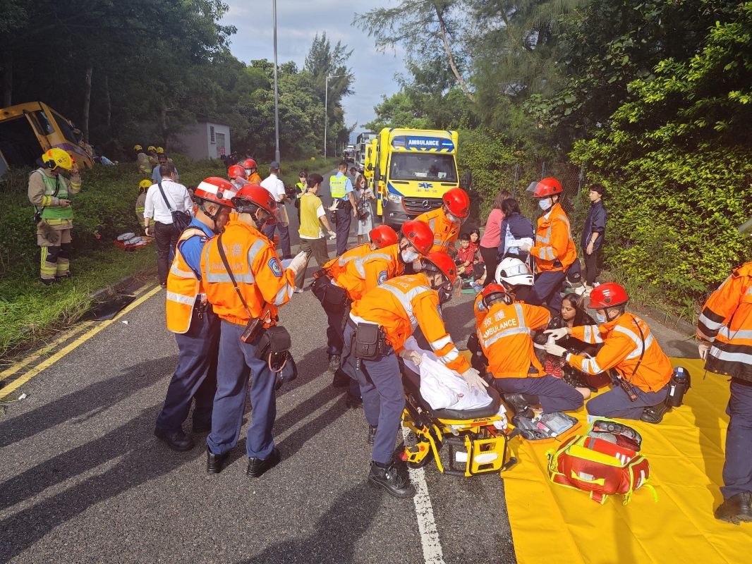 馬路的事FB圖片。 事故造成至少34人受傷,當中3人情況較為嚴重,包括校巴司機及2名男學童。其中一名男學童由擔架床送上救護車。部分學童未有受傷,自行下車,亦有學童頭部受傷,坐在地上由救護員包紮。 巴士司機亦告受傷,獲救時清醒,至於巴士乘客大部分可自行下車疏散。所有傷者分別送往北大嶼山、瑪嘉烈、仁濟及屯門4間醫院。