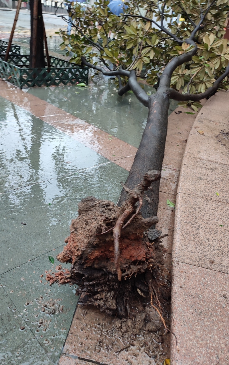 下午風勢增強,北角一處發生樹,狂風將一顆樹連根拔起。