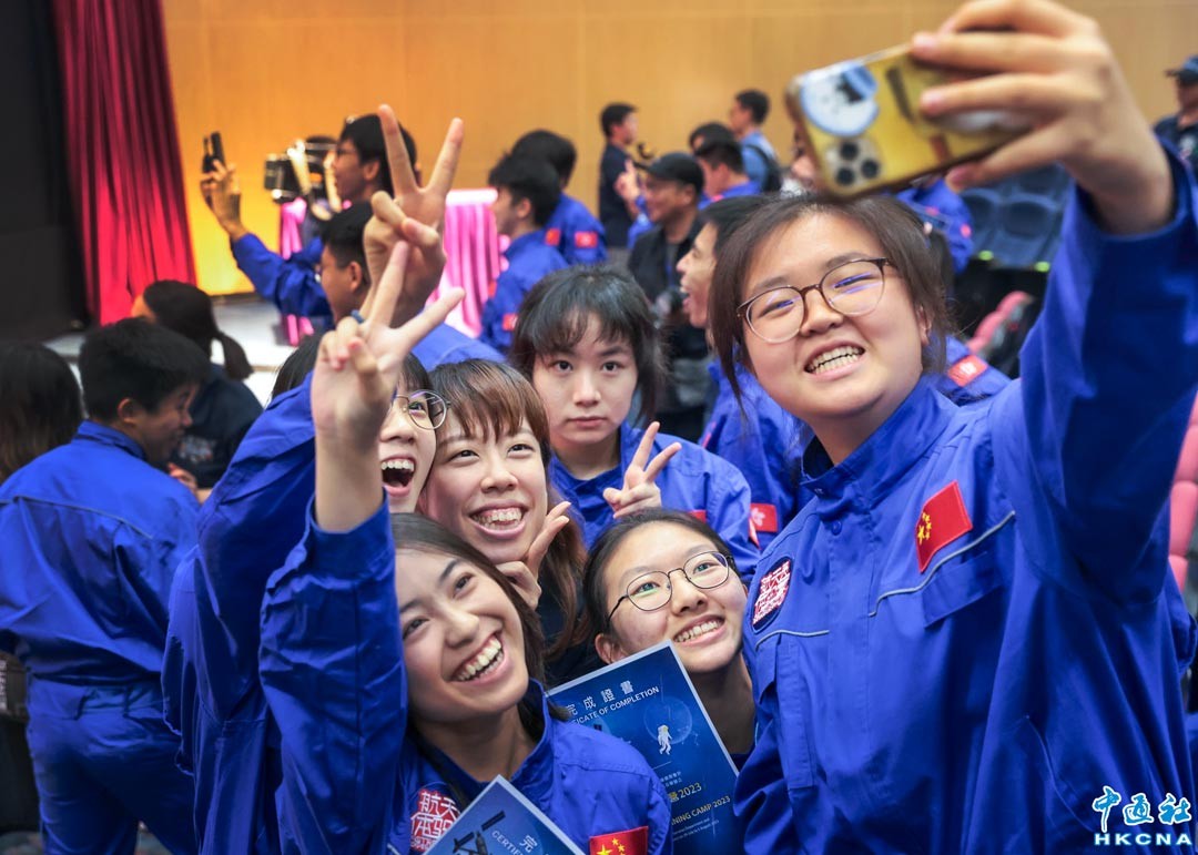 30位香港中學生參與由香港太空館策劃的“少年太空人體驗營2023”,在北京及青海冷湖等地完成為期八日的體驗營,8月29日,於香港太空館舉行的分享會上獲頒發證書。圖為學員在分享會後開心自拍。(香港中通社記者 謝光磊攝)