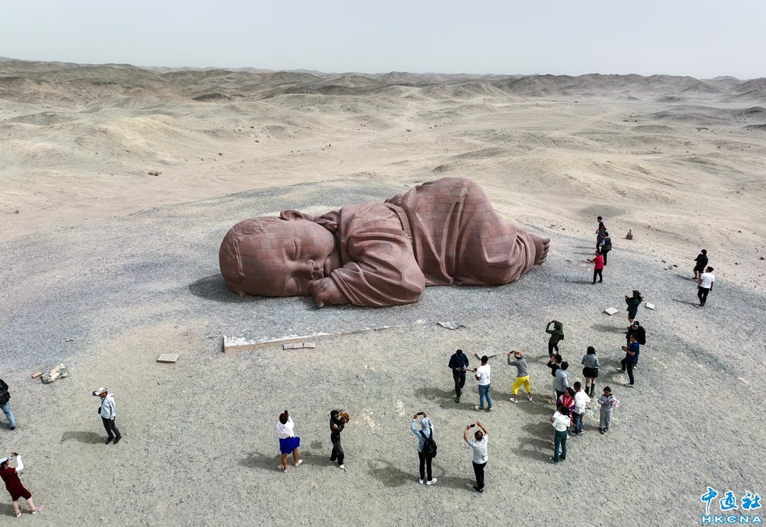 8月30日,遊客在瓜州戈壁國際雕塑藝術長廊參觀大型雕塑《大地之子》。瓜州戈壁國際雕塑藝術長廊的大型雕塑,串起了一道亮眼的人文風景線,展現出獨特的藝術魅力,吸引大批遊客前往。據統計,8月中旬,景區單日遊客量達10000餘人次。《大地之子》雕塑長15米、高4.3米、寬9米,趴伏在甘肅省瓜州縣紅山坡戈壁灘上,成為一處壯觀的戈壁文化景觀。 香港中通社圖片