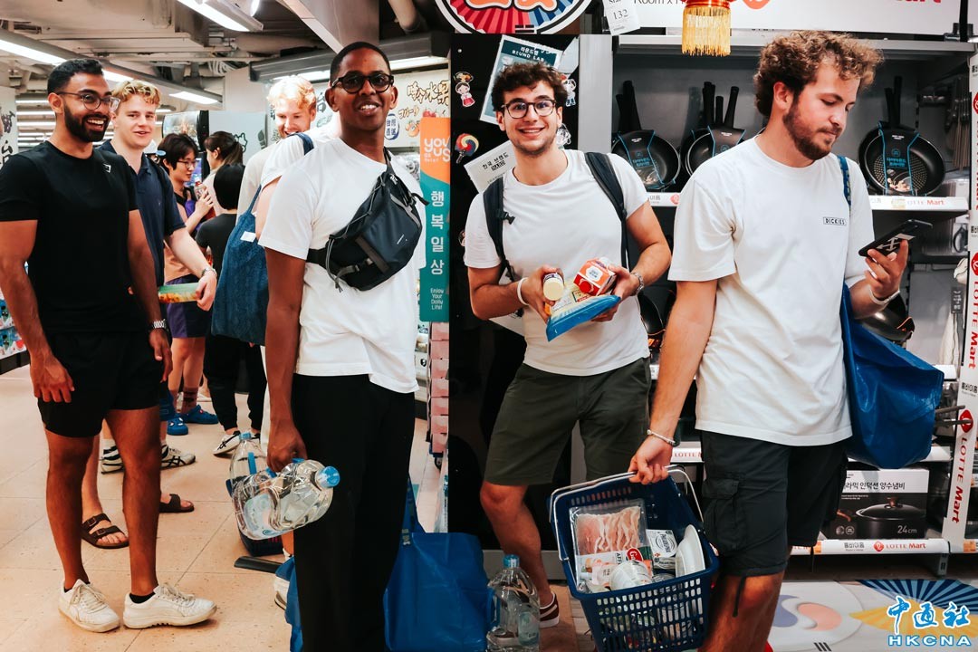 隨著超強颱風“蘇拉”逼近,香港天文台預告會在9月1日凌晨2時至5時改發八號風球。8月31日,香港超市再現搶購潮,新鮮蔬菜、麵包和冰鮮肉貨架幾乎被搶購一空,僅有少量供選擇,等候結賬的市民也排起長龍。圖為外國留學生也加入搶購大軍。(香港中通社記者 謝光磊攝)