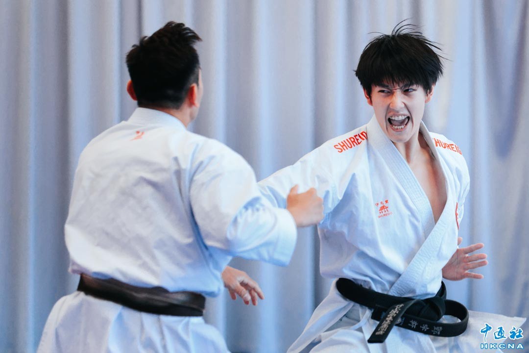 中國香港空手道運動員將參加杭州第19屆亞運會,現正積極備戰。香港體育學院與中國香港空手道總會8月31日安排參賽運動員和教練與傳媒會面,分享備戰情況及期望。圖為運動員鄧宇軒(右)示範團體形。(香港中通社記者 許其皓攝)