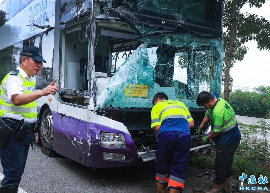 8月31日早上,香港東涌翔東路一輛校巴與一輛雙層大巴相撞,兩車其後衝入路邊草叢,大巴車頭和校巴車身嚴重損毀,意外造成至少造成37人受傷,其中3人傷勢嚴重。圖為大巴車頭嚴重受損。(香港中通社記者 許其皓攝)