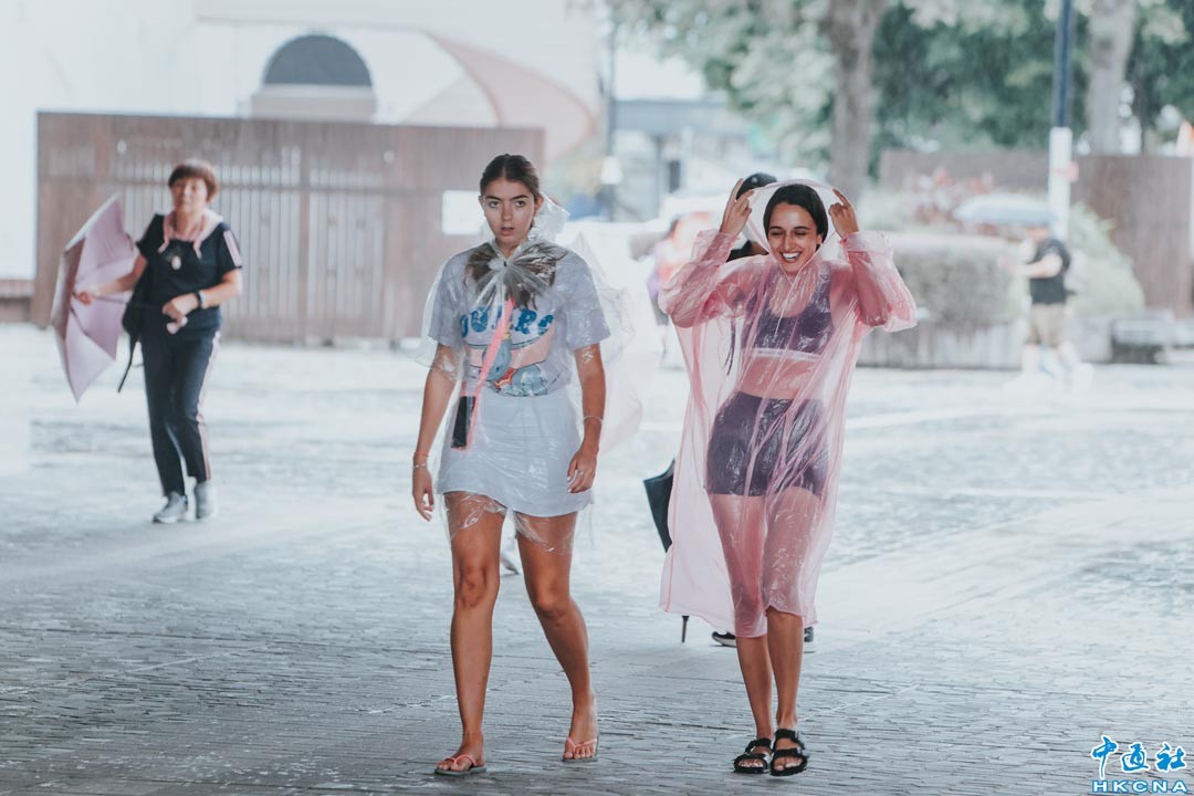 9月1日,超強颱風“蘇拉”逼近,香港天文台在晚上8時15分發出十號颶風信號,預料會維持一段時間。圖為市民頂著狂風暴雨出行。(香港中通社記者 謝光磊攝)