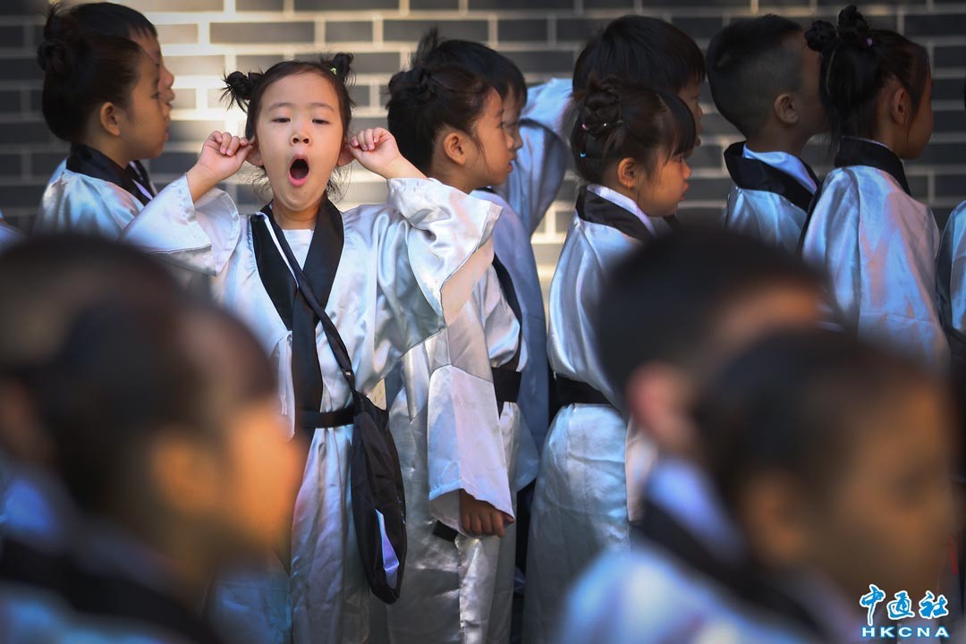 9月1日,江蘇南京,身著古裝的孩子准備參加開筆禮儀式。當日,南京夫子廟小學的一年級新生來到夫子廟廣場舉行開筆禮,孩子們行古禮、點朱砂、聆聽師長寄語,在傳承傳統文化的儀式中開啟人生“第一課”。 香港中通社圖片
