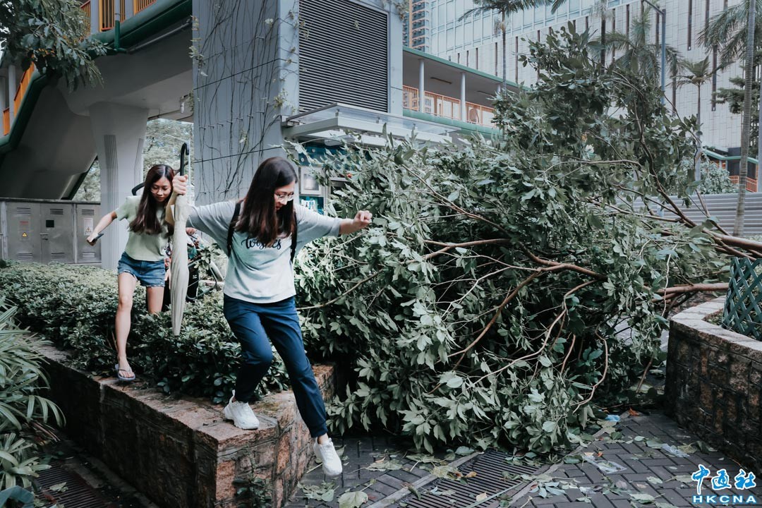 9月2日,隨著“蘇拉”遠離香港,本港風力逐步減弱。經過“蘇拉”一夜吹襲,香港特區多地出現不同程度受損情況,路面隨處可見倒塌的樹木等雜物,台風威力不容小覷。圖為香港街頭路面一片狼籍,倒塌的大樹阻擋道路,市民只能翻越旁邊的花壇前行。(香港中通社記者 謝光磊攝)