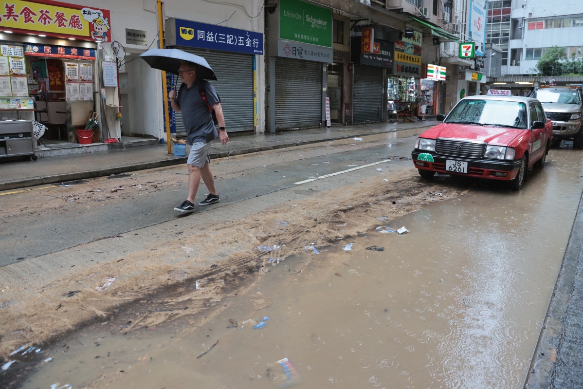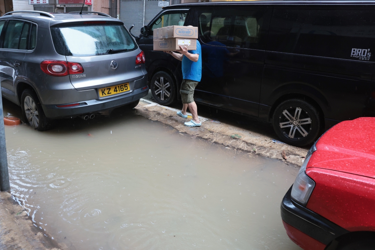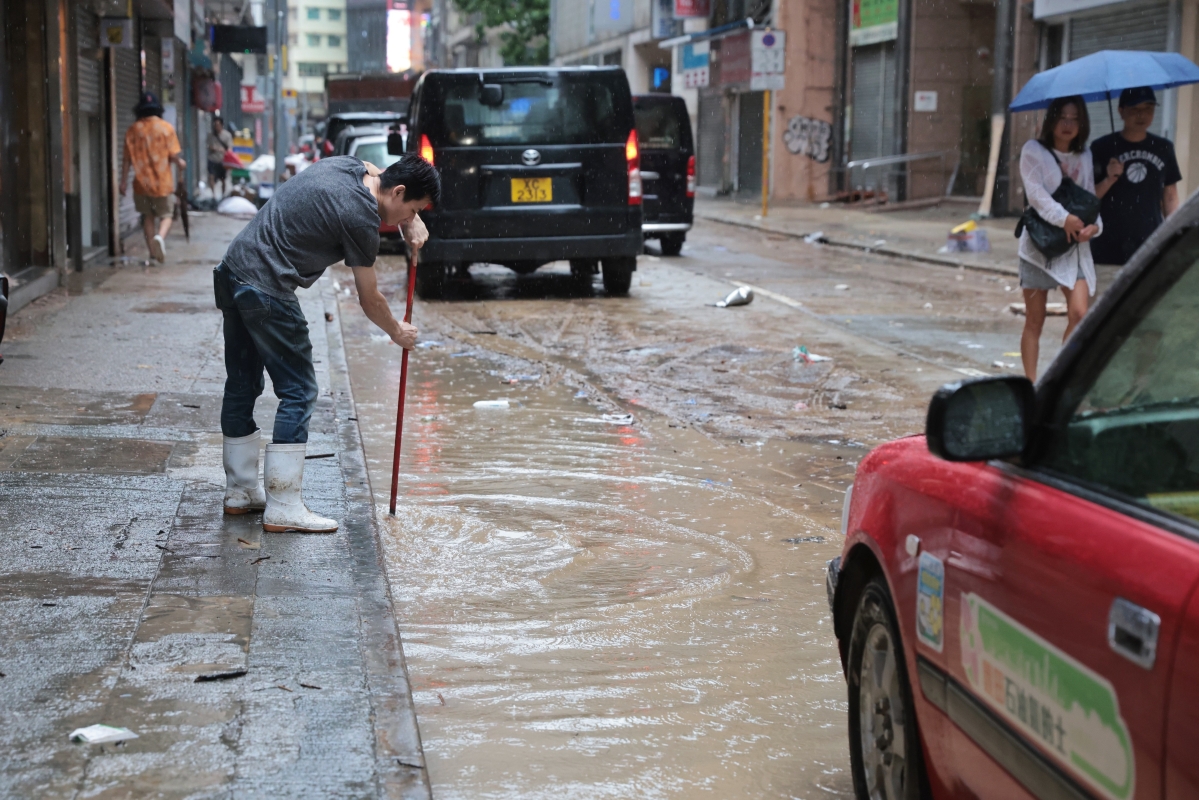 灣仔街頭嚴重水浸,有市民在清理排水渠