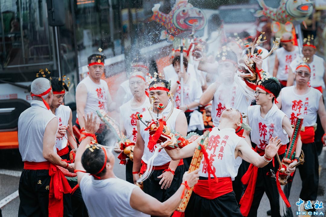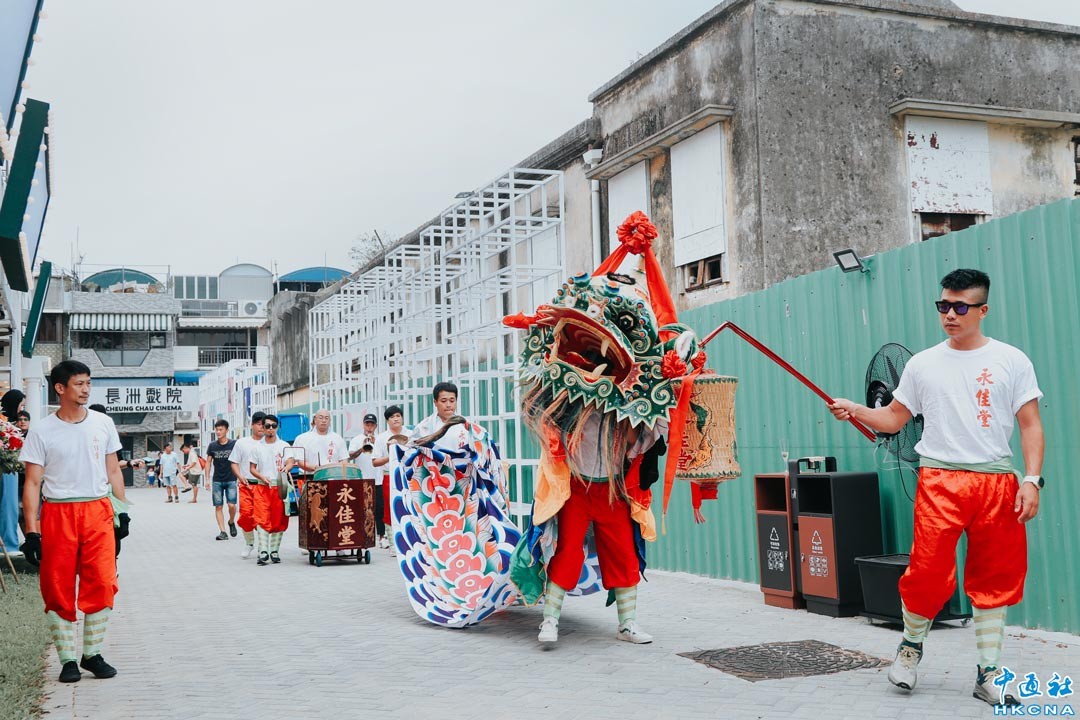 香港長洲戲院多元文化園區9月6日舉辦開幕典禮。長洲戲院於1931年落成,獲古物古蹟辦事處評定為三級歷史建築,經活化工程漫長的勘探、復修和規劃後變身成為藝文生活空間的長洲戲院,將於9月7日正式開放予公眾。圖為舞麒麟表演。(香港中通社記者 許其皓攝)