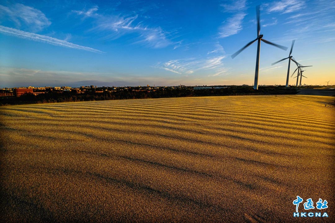 台灣桃園觀音草漯沙丘地質公園,位於富林溪北岸,沿海延綿8.1公里的沙漠景象,有"台版撒哈拉沙漠"之稱。沙丘加上藍天、風車、防沙籬、濱刺麥,形成一幅別緻風景。 “濱刺麥”會長出像海膽般的刺球花朵,乾枯掉落以後隨著風吹在地上滾動,就像沙灘上的滾動海膽,可愛又有趣。 香港中通社圖片