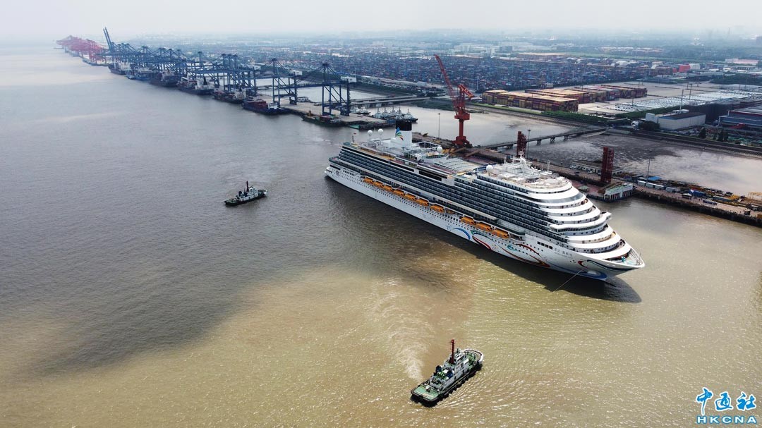 9月7日,首艘國產大型郵輪“愛達·魔都號”在拖船的牽引下,緩緩地駛離於中國船舶集團有限公司旗下外高橋造船4號碼頭,開啟完工驗證試航。這是繼7月24日圓滿完成第一次試航所有試驗項目,時隔45天再次整裝啟航,全面實施最終的完工試航計劃。據悉,這次完工試航將對涉及31份調試程序90餘項海試項目開展測試和檢驗。參加這次完工試航的有船東、船檢、承包商、服務商以及外高橋造船的工程技術人員1300多人。圖為航拍首艘國產大型郵輪“愛達·魔都號”開啟完工驗證試航。 香港中通社圖片