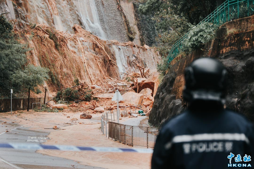 9月8日,香港筲箕灣耀東邨耀興道發生山泥傾瀉。香港遭遇自有紀錄以來最大暴雨,香港受颱風低壓槽影響降暴雨,多區水浸。天文台於9月7日晚11時05分發出黑色暴雨警告,特區政府9月8日早上啟動“極端情況”安排。(香港中通社記者 許其皓攝)