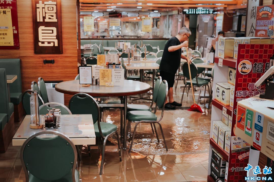 9月8日,香港遭遇自有紀錄以來最大暴雨,多區水浸。香港灣仔受影響嚴重,大批商戶遭遇水浸,商戶積極自救。圖為當日早上,灣仔一間食肆內,店員正在清理店內積水和淤泥。(香港中通社記者 謝光磊攝)