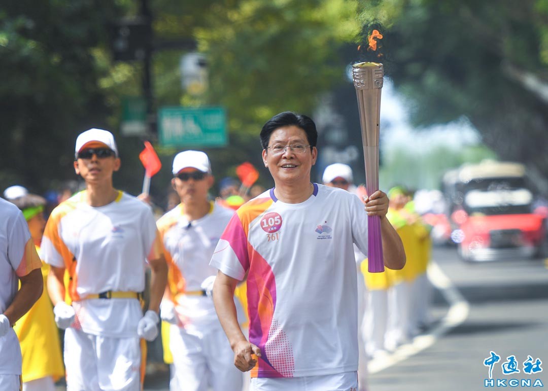9月8日,火炬手、時代楷模陳立群在傳遞火炬。當日,杭州亞運會火炬傳遞在杭州西湖湧金公園廣場啟動,共有106棒火炬手參與當日傳遞。 香港中通社圖片