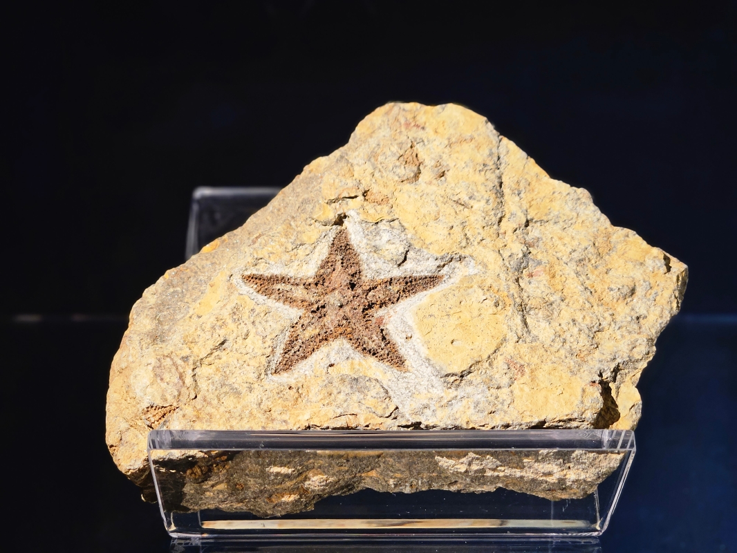 海星綱,4.58億至4.43億年前。(香港中通社記者 黃璇攝) 香港特區政府文化體育及旅遊局局長楊潤雄在展覽開幕儀式現場介紹,今次展出的珍貴化石標本,主要由國家自然博物館借出。這些化石橫跨30億年,從中可以認識不同時期的物種,以及了解牠們如何展現生命的韌力,適應大滅絕後的環境。 穿過昏暗的走廊,弧形牆上展示來自埃迪卡拉紀、寒武紀和奧陶紀的海洋生物化石,讓觀者仿如置身遠古的海洋,開啟一場由6億3500年前埃迪卡世紀以來,地球生命經歷各種的生命演化體驗,一探古生物學的世界,小至微小的單細胞生物,大至龐大恐龍。