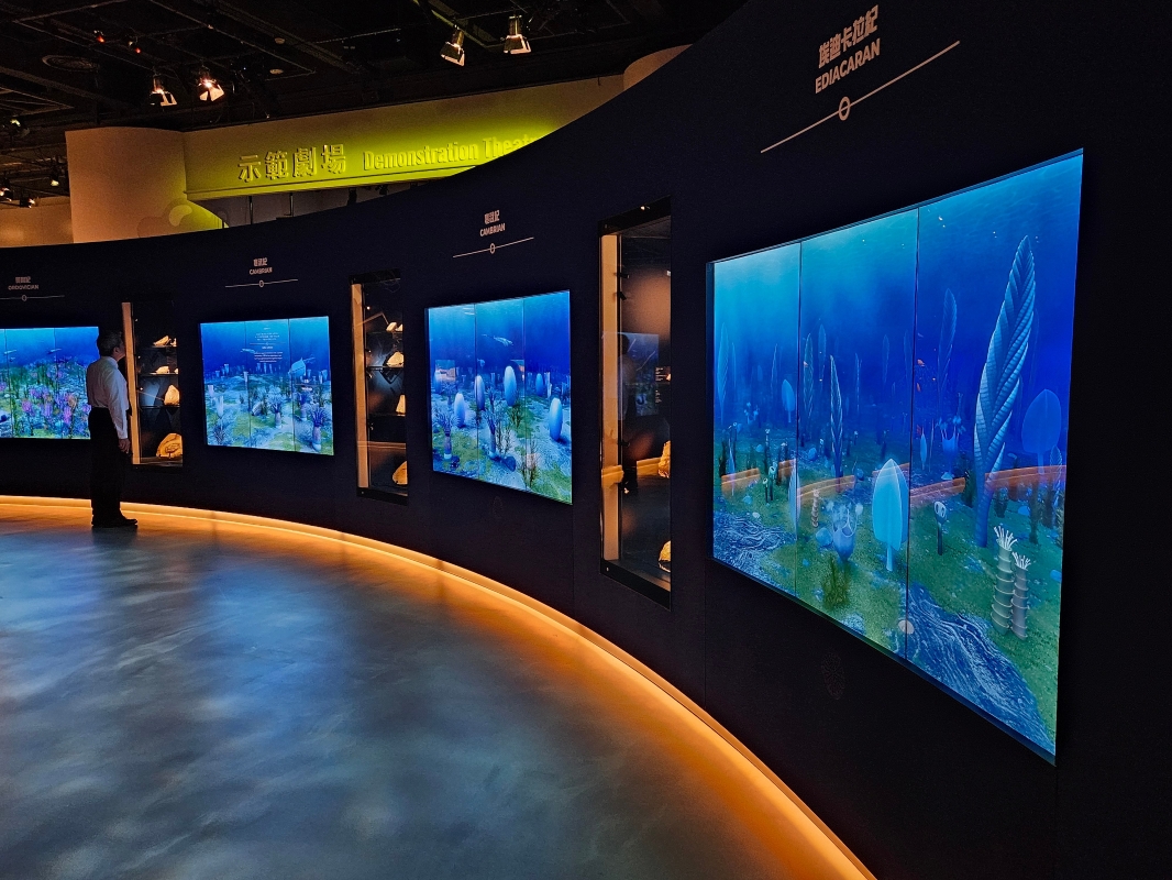 弧形墻上展示來自埃迪卡拉紀、寒武紀和奧陶紀的海洋生物化石。(香港中通社記者 黃璇攝) “滅絕.新生”展覽涵蓋六大展區,按照地球演變過程中的五次大滅絕時期,分成“埃迪卡拉紀─奧陶紀”“志留紀─泥盆紀”“石炭紀─二疊紀”“三疊紀”“侏羅紀─白堊紀”“古近紀─現在”。 現場除展示一系列古生物化石之外,互動展品新奇有趣,當中有一隻機械暴龍名保羅,其旁的展示板顯示保羅的幾大死因,觀眾可化身偵探思考其真實死因。此外,展廳更展示在香港出土的古生物時期的菊石、蕨類等動植物化石。