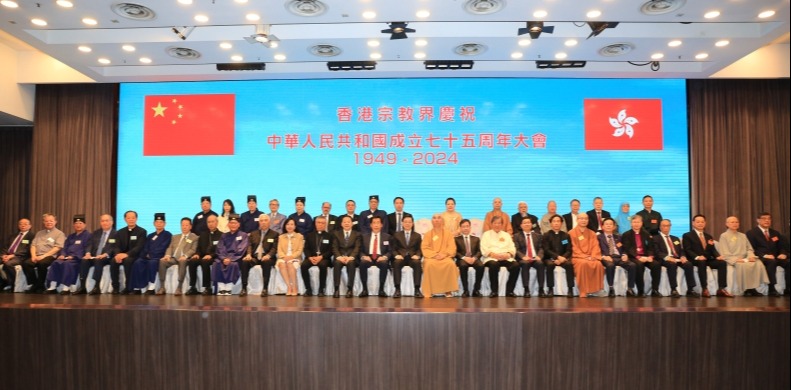 香港宗教界舉辦慶祝中華人民共和國成立七十四周年大會香港新聞網9月19日電 19日晚上,香港宗教界在香港尖沙咀舉行“香港宗教界慶祝中華人民共和國成立七十四周年大會”,香港特區政府政務司司長陳國基、香港中聯辦協調部部長朱文出席主禮,並與香港特區政府民政及青年事務局局長麥美娟、香港中聯辦協調部副部長陳澤濤、各宗教領袖、代表,共同向國家送上真誠祝福。
