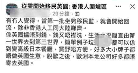 社交媒體截圖 該港人形容,在香港的某平價迴轉壽司,在英國都變高級日本餐廳。此外,在英國購物不方便,不少品牌都無意拓展英國市場,且英國脫歐後,許多歐洲公司便不再提供往英國的寄送服務。 至於住房問題,他表示,在英國買樓平均需要三百至四百萬港元,以當地人工計算,供款期比在香港更長。而香港的樓雖然又小又貴,但周邊配套完善,而“英國你房子有多大,你生活空間就只有這麼大。” 該港人的發言其實道出部分移英港人心聲。不過路是自己選的,一些移英港人也只能“打落牙齒往肚裡吞”,口是心非地誇英國好了! 【編輯:李冉】