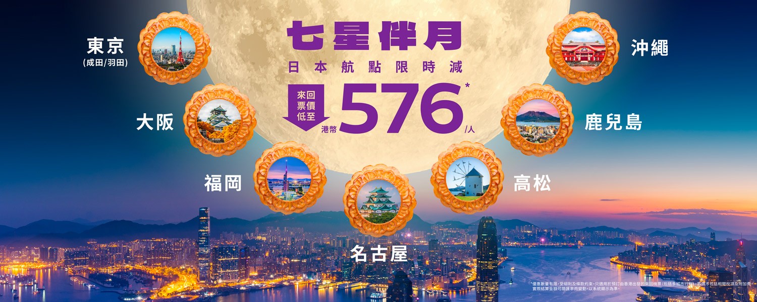 香港新聞網9月29日電 今天為中秋節正日,香港快運(HK Express)特意送上中秋限定優惠——機票版“七星伴月”!日本熱門航點來回票價低至HK$ 576,連稅則為HK$1,356起。包括東京(成田/羽田)、大阪、福岡、名古屋、沖繩以及獨家直航的高松、鹿兒島。經網站預訂機票更可以預訂open-jaw開口機票,玩盡整個日本!