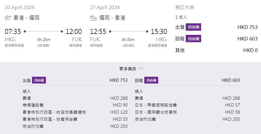 以飛福岡為例,來回連稅HK$1356起。 【編輯:黃璇】