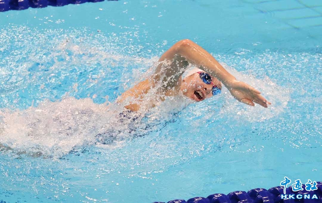9月25日,“香港女飛魚”何詩蓓在比賽中。何詩蓓在女子200米自由泳中,以1分54秒12的成績刷新亞運會紀錄並獲得冠軍,為港隊奪得歷來首個游泳項目金牌。(香港中通社記者 洪少葵攝)