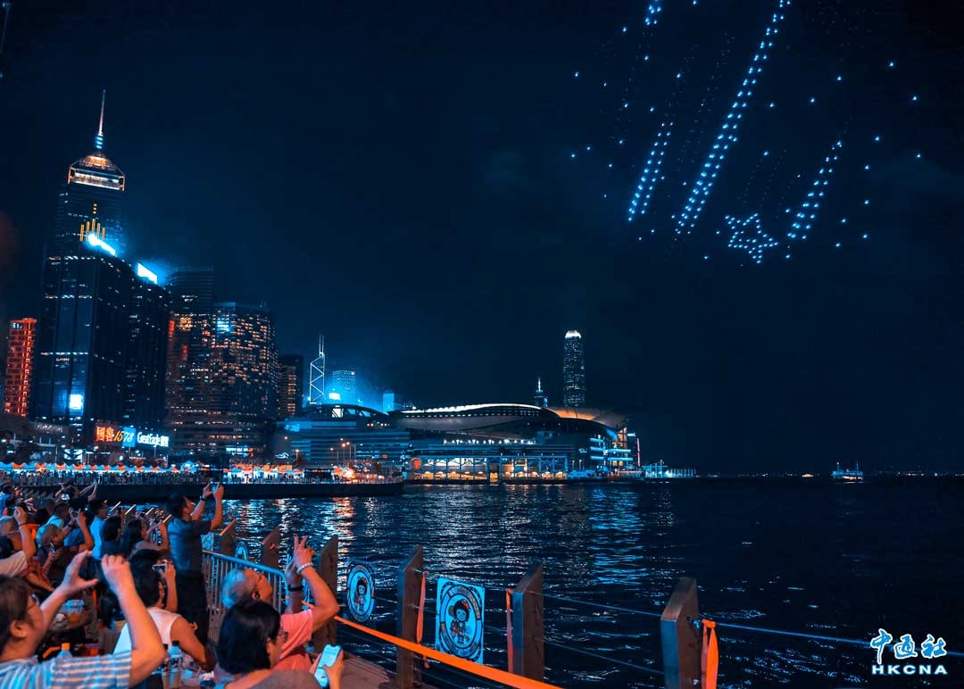 9月27日,首個懷舊香港夜市“海濱藝遊坊”開鑼,晚上8時許,維港夜空800架無人機進行燈光表演,呈現多個香港特色地標及香港本土藝術文化,吸引大批公眾觀看。(香港中通社記者 曹文毓攝)