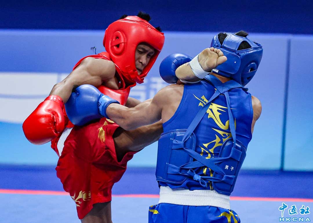 9月28日,亞運會武術項目進行男子和女子散打決賽產生7金。中國散打隊男子56公斤級江海東(右)战胜菲律賓選手阿內爾 曼達爾获得金牌。(香港中通社記者 洪少葵攝)
