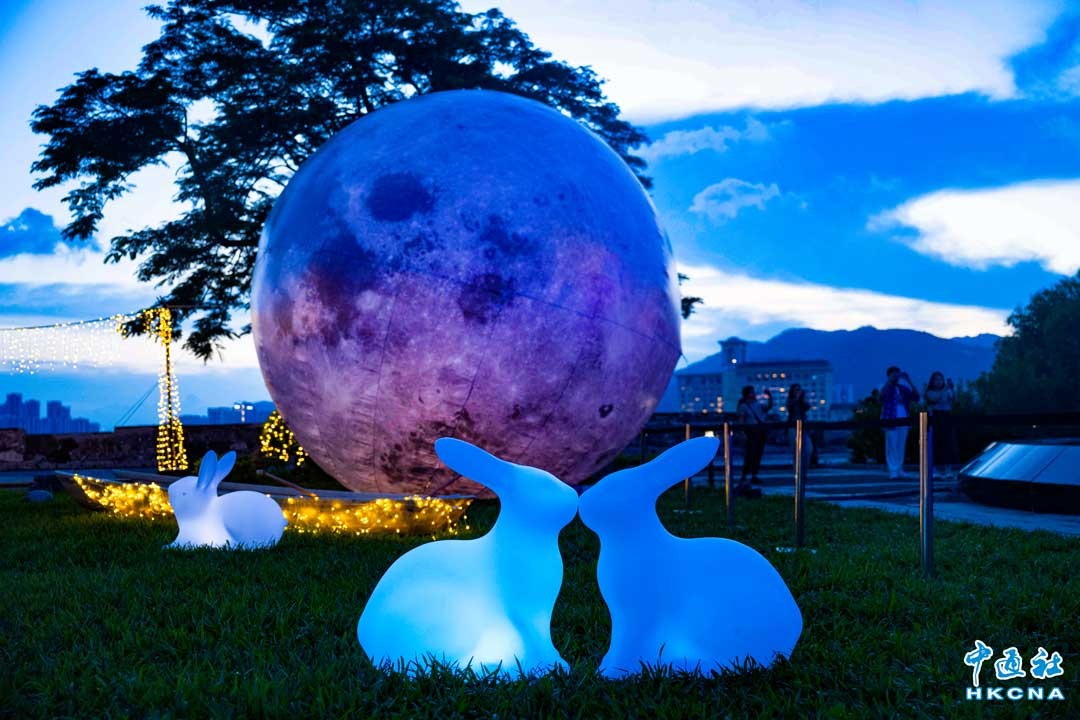 9月29日中秋節,香港炮台山東岸公園設有近8米高的大型月亮,以及一眾中秋彩燈,不少市民與家人共同在此“賞月”。(香港中通社記者 曹文毓攝)