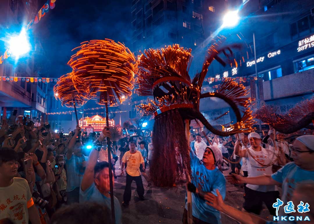 9月28日是中秋迎月日,因疫情停辦三年的香港大坑舞火龍當晚起一連三晚舉行,逾300名健兒揮舞著閃爍的火龍,在大坑各街道間穿梭。大坑舞火龍的歷史可以追溯到19世紀,相傳當時大坑這客家小村因風災、瘟疫受困,村民紮作火龍,中秋前後巡遊,瘟疫停止。此後,大坑村便每年舉行舞火龍活動,以保合境平安。(香港中通社記者 許其皓攝)