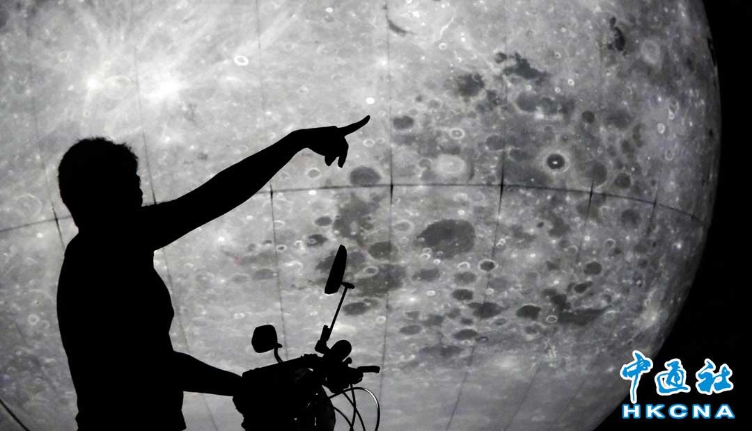 9月29日,台灣宜蘭縣冬山鄉在中秋佳節舉行“月亮什麼冬冬”,透過主視覺13公尺高的月亮裝置藝術,讓民眾歡度月圓人團圓的快樂時光。現場另有火箭、飛碟、太空人漫步等裝置藝術,把冬山火車站廣場營造成浩瀚宇宙意象。圖為月亮裝置藝術相當於4層樓高,夜間點亮後,吸引民眾賞月,被戲稱是超級人工大月亮。 香港中通社圖片