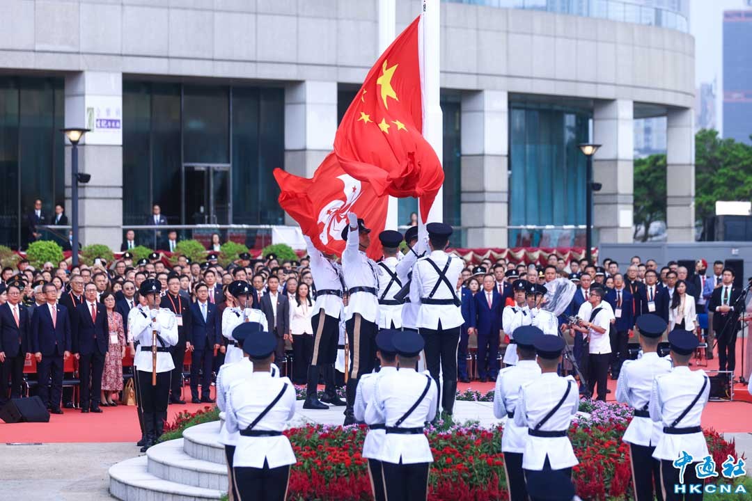 10月1日上午,香港特區政府於金紫荊廣場舉行升旗儀式,慶祝中華人民共和國成立74周年。8時正,中華人民共和國國旗及香港特區區旗在莊嚴的國歌聲中冉冉升起。(香港中通社記者 許其皓攝)