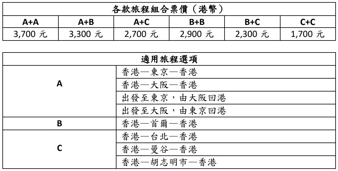 各款旅程組合票價如下(不包括相關税項及燃油附加費):