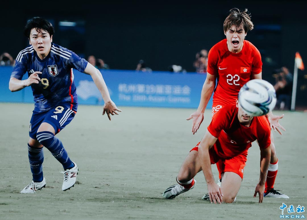 10月4日晚,備受矚目的杭州亞運會男子足球半決賽在杭州蕭山體育場進行,歷史性打入4強的香港隊對陣日本隊,港隊奮力拼搏,博得全場觀眾打氣加油。結果中國香港(紅衣)以0比4負日本,無緣決賽。(香港中通社記者 洪少葵攝)