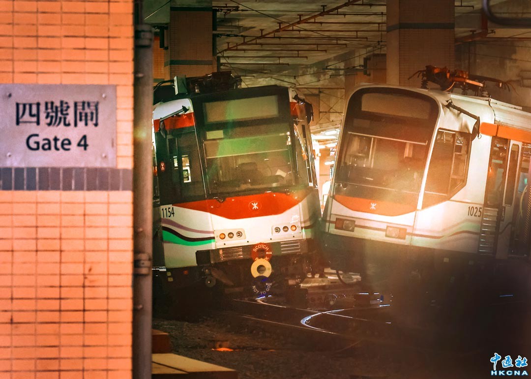 10月4日,香港輕鐵元朗站早上發生列車相撞意外,一列載客輕鐵與一列空車相撞,3名女乘客受傷。 (香港中通社記者 曹文毓攝)