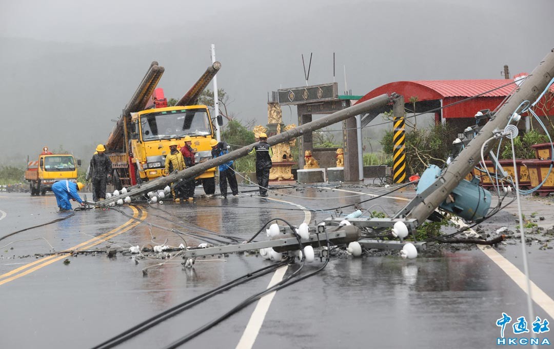 10月5日上午,颱風“小犬”在台灣鵝鑾鼻附近登陸後進入台灣海峽南部,為南台灣帶來災情,屏東恆春往滿州的道路整排電線桿倒塌。 香港中通社圖片