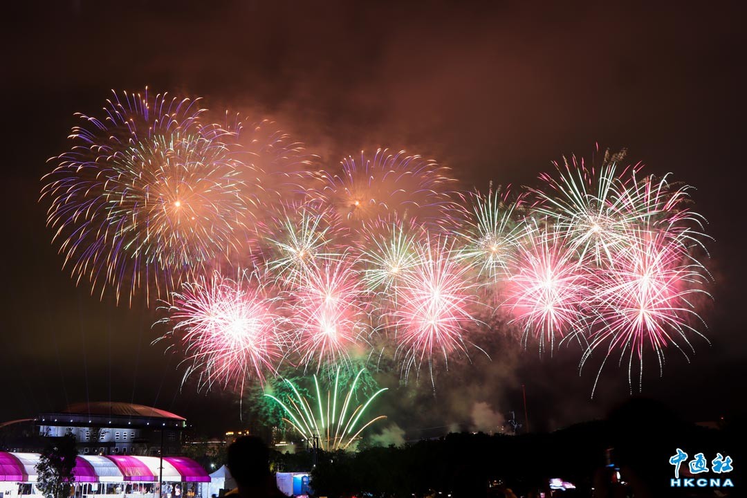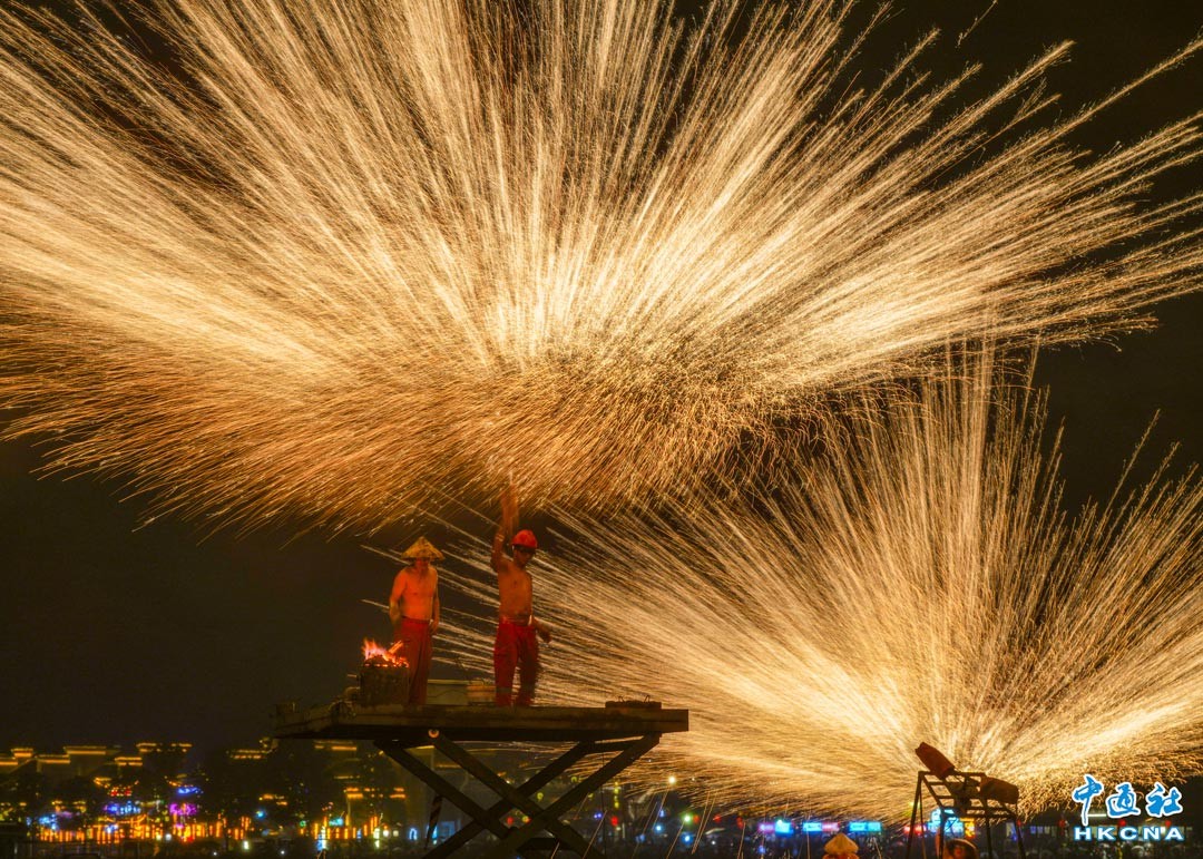 10月4日晚,湖南長沙銅官窑古鎮上演了非遺絕技“打鐵花”,吸引了眾多遊人。據悉,6位民間藝人在中秋國慶假期每日需耗時1.5個小時燒制300斤鐵水,每人平均揮臂擊打鐵水160次,為遊客完成10分鐘表演。圖為鐵水被藝人打向夜空。 香港中通社圖片