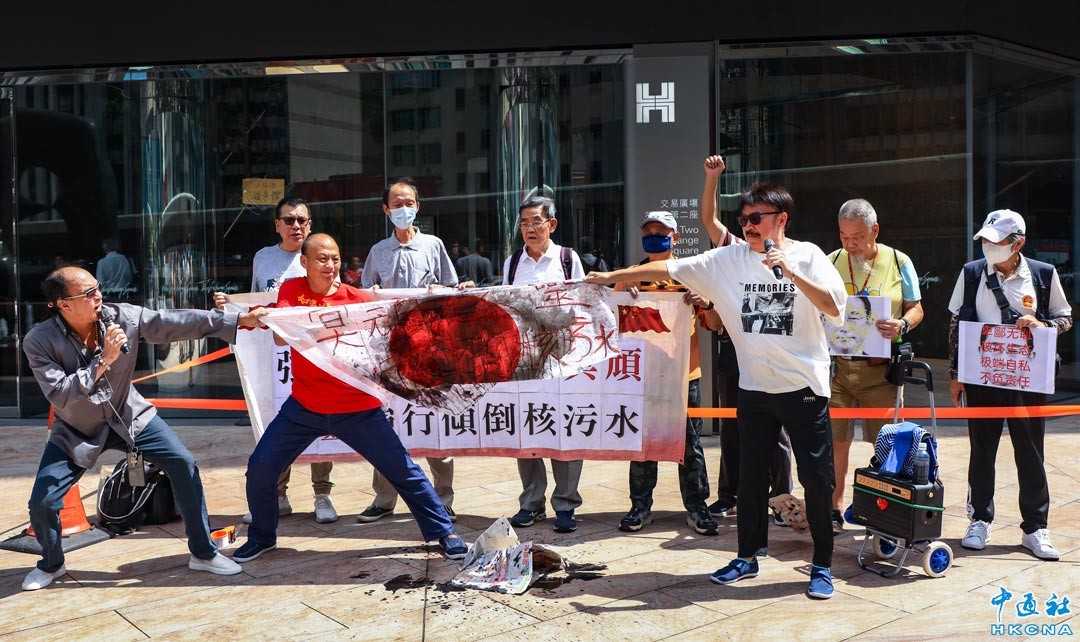 10月6日,香港有市民到日本駐香港總領事館外抗議,譴責日本傾倒核污水。(香港中通社記者 許其皓攝)