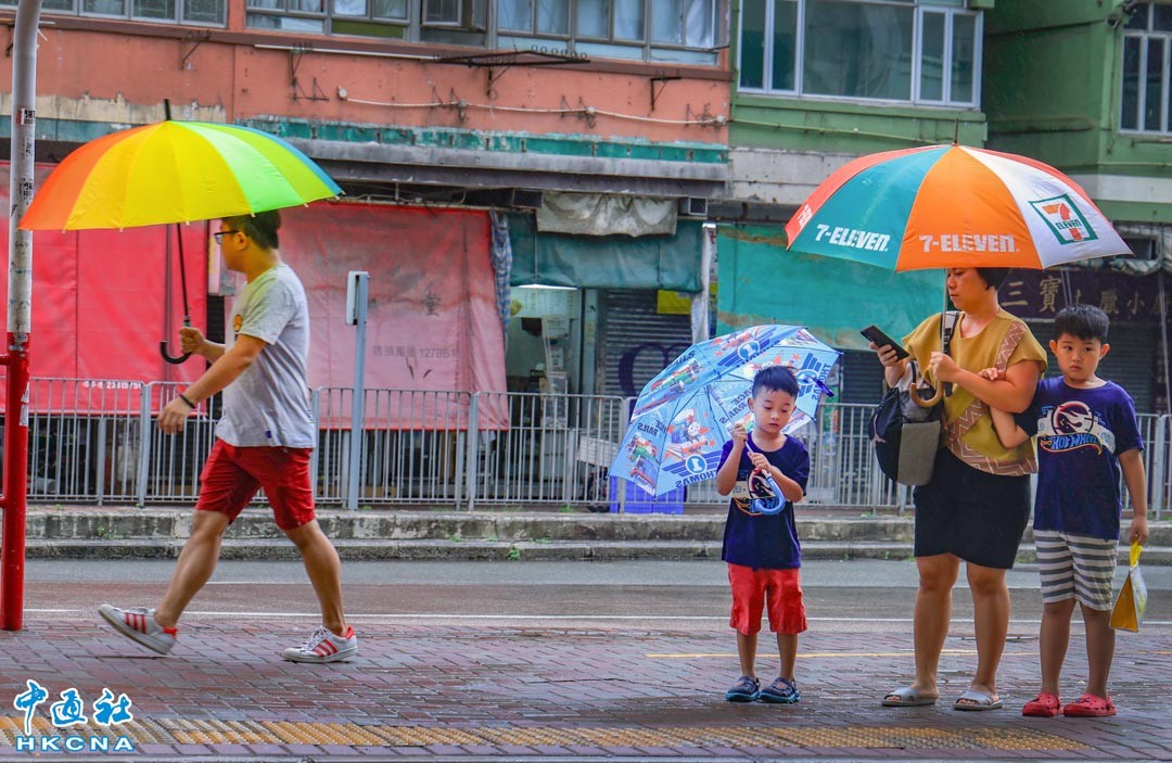 10月8日,香港天文台下午12時40分改發八號東北烈風或暴風信號。圖為市民冒雨出街。(香港中通社記者 曹文毓攝)
